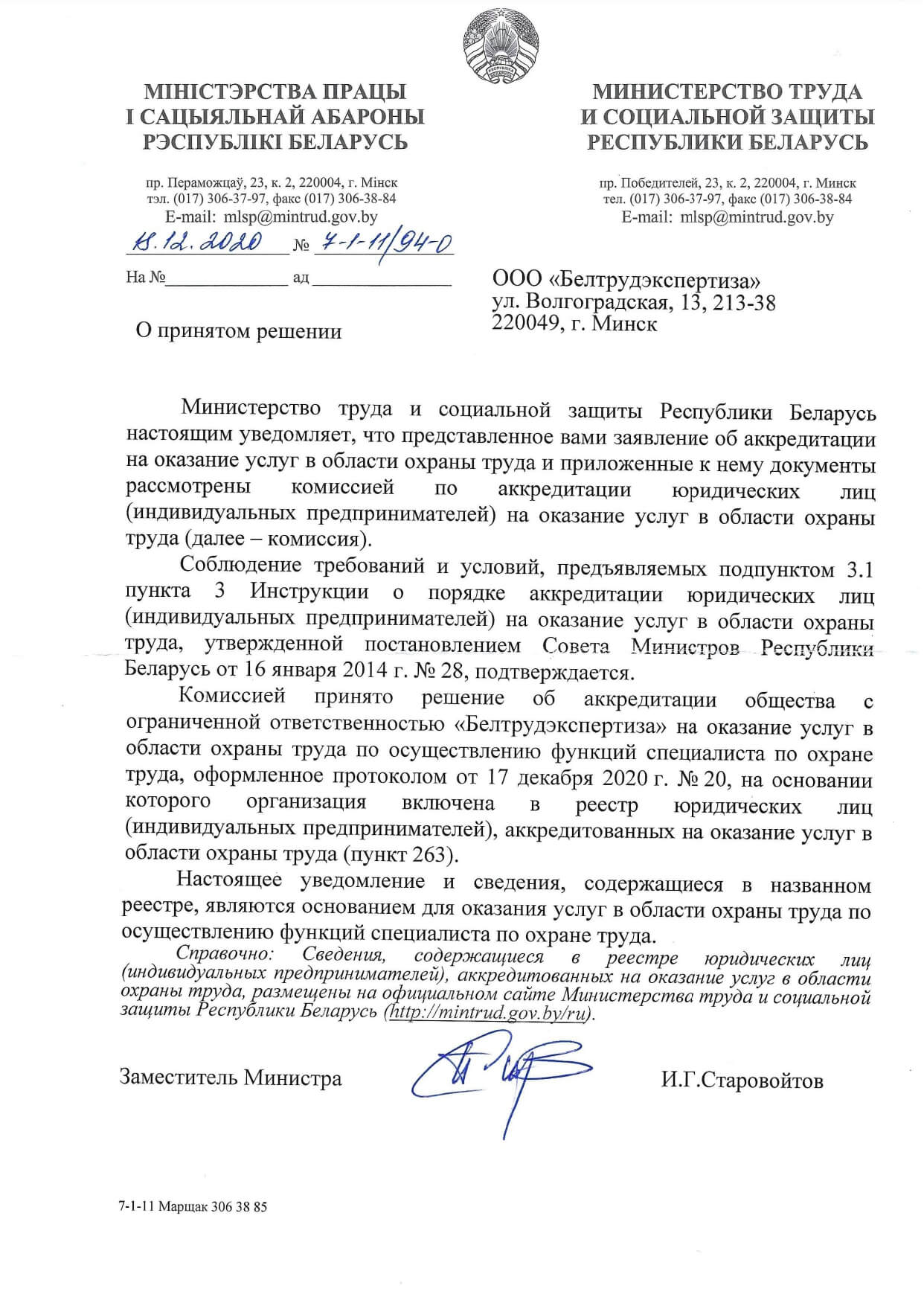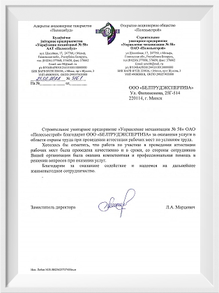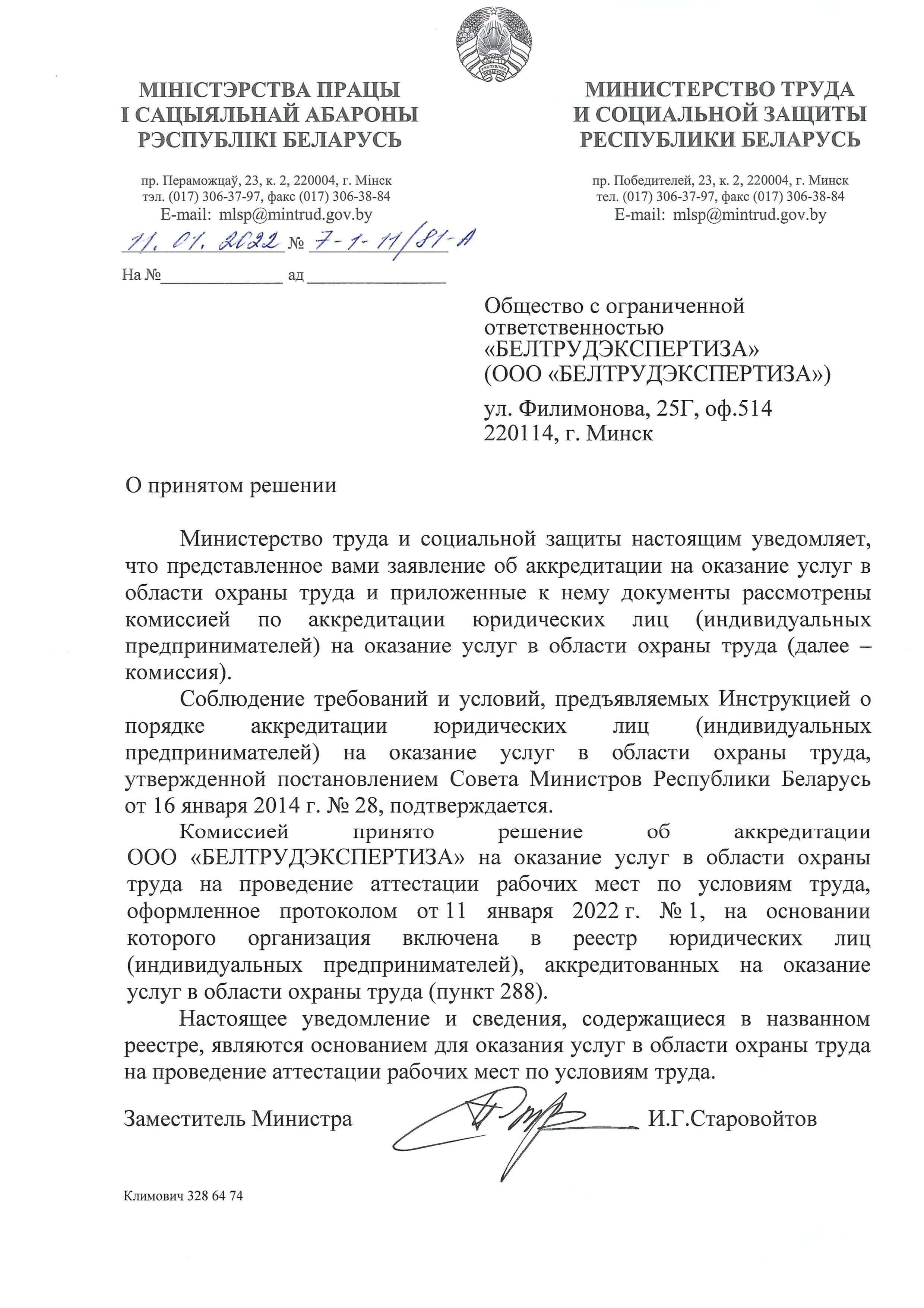ООО «БЕЛТРУДЭКСПЕРТИЗА» аккредитовано, зарегистрировано в реестре юридических лиц (индивидуальных предпринимателей), аккредитованных на оказание услуг в области охраны труда, и имеет право на проведение аттестации рабочих мест.
