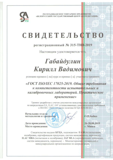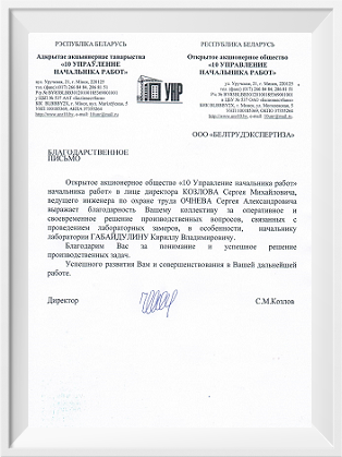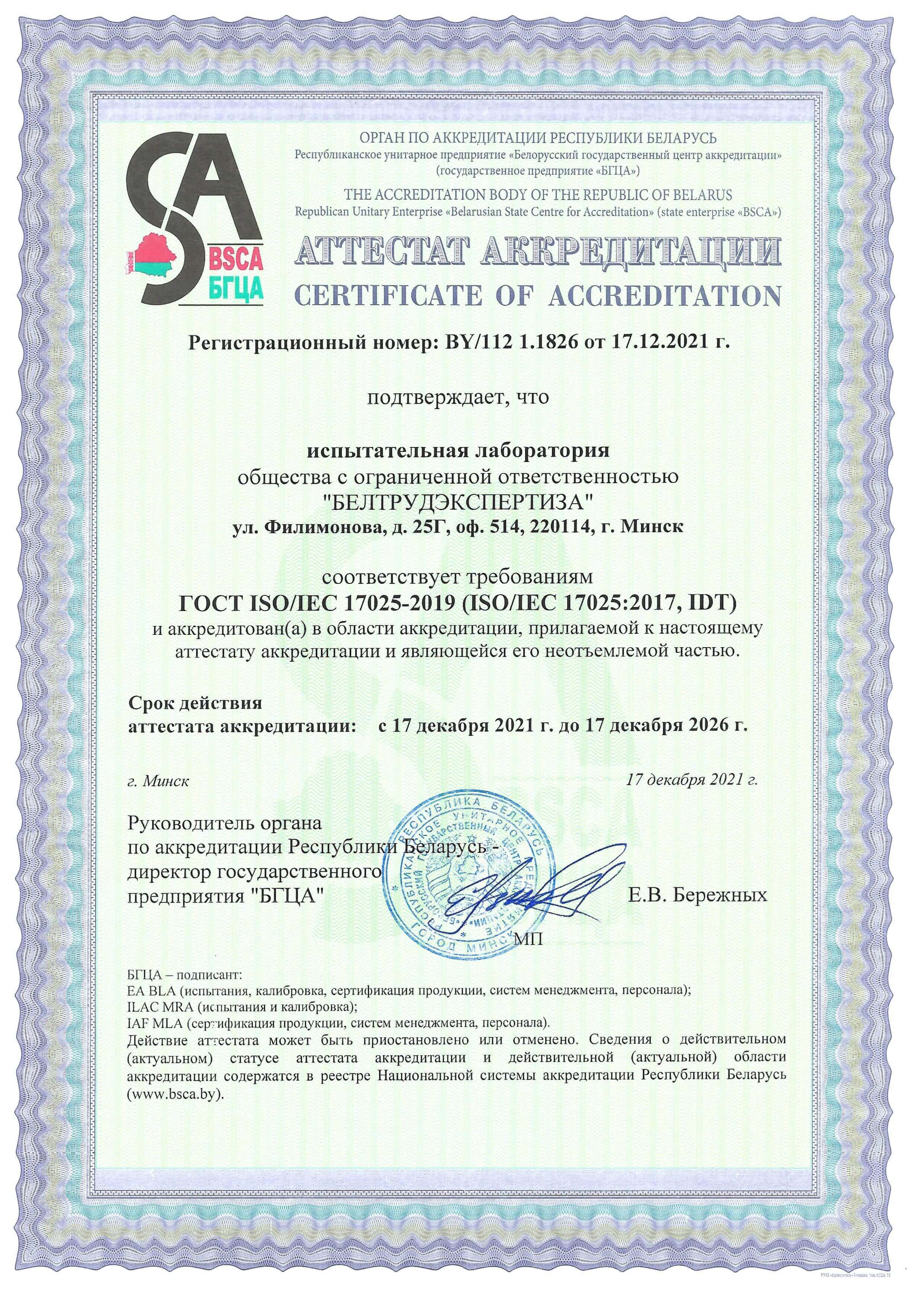 Испытательная лаборатория ООО «БЕЛТРУДЭКСПЕРТИЗА» соответствует критериям Национальной системы аккредитации Республики Беларусь и аккредитована на соответствие требованиям ГОСТ ISO/IEC 17025-2019. Аттестат аккредитации BY/112 1.1826 до 17.12.2026.